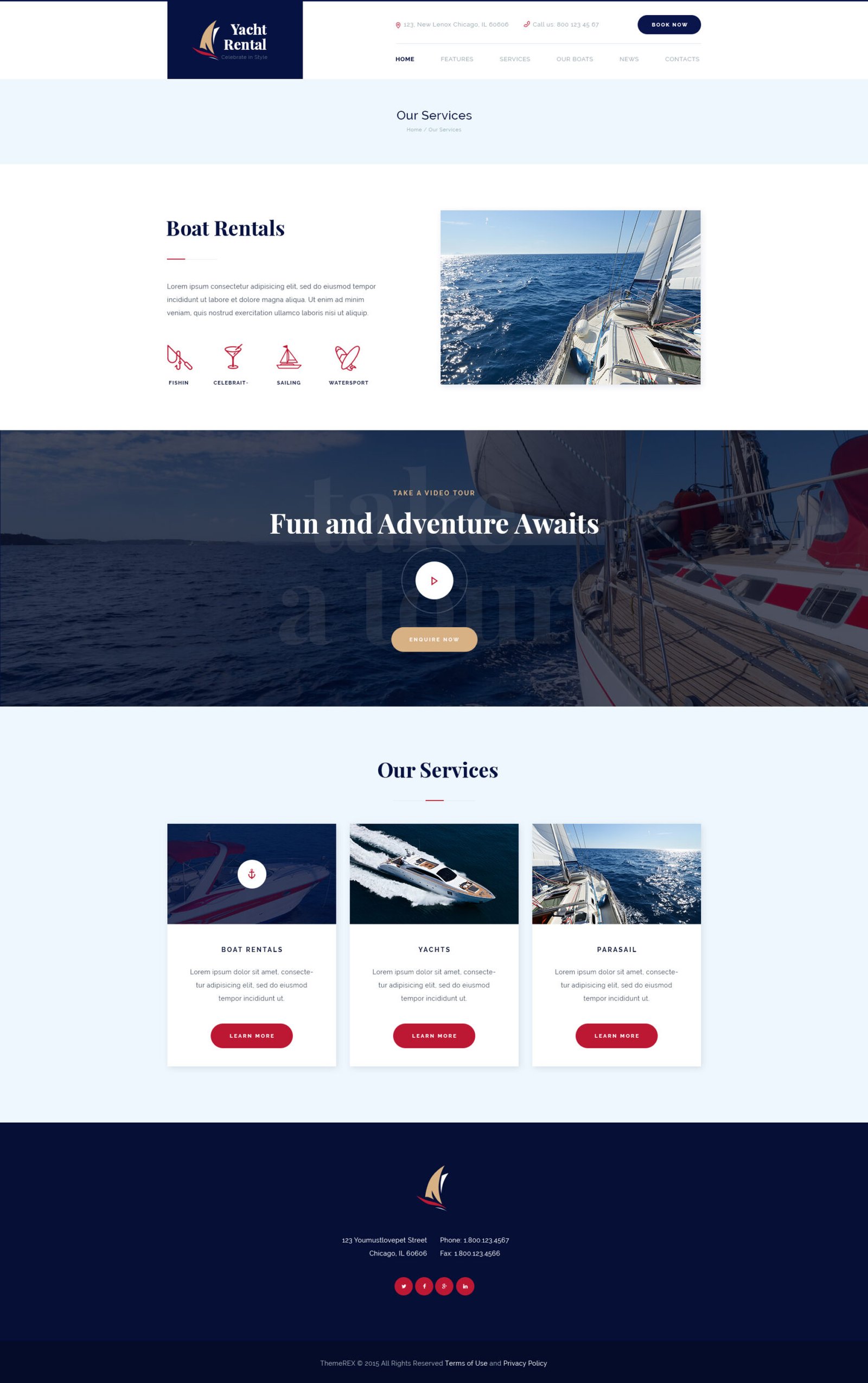 The theme already has additional services: fishing firm, sail bureau, celebration, sailing, water sport, sailboat, regatta, surfing, windsurfing, parasail, cruise and yacht charter. It is perfect for boat and yacht booking.